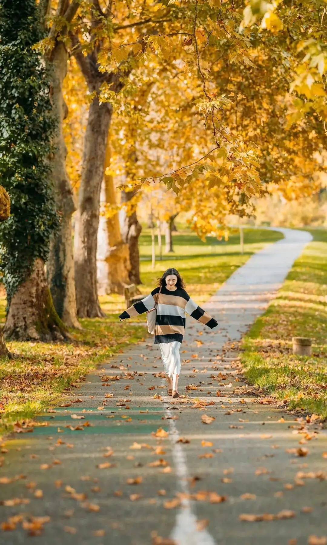 人物迎着秋光舒展双臂,脚步轻缓地踩在落叶小径上,毛衣的宽袖随动作自然晃开,自带松弛的雀跃感。不用刻意凹型,让笑意顺着眉眼漫开,身体跟着步伐轻轻舒展,背景的金黄树影裹着暖光,把秋日的鲜活感直接焊在画面里