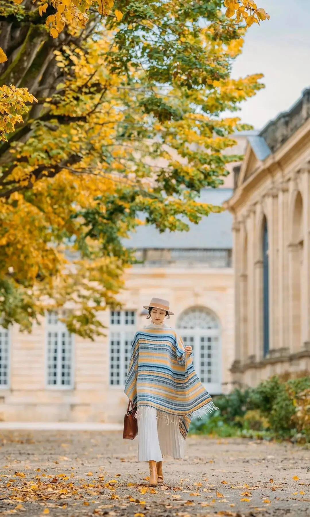 人物缓步走在秋意里,一手轻拎包袋,一手松松牵着披肩的流苏,让织物随步伐轻晃出柔和弧度。微微垂眸的神态衬出慵懒,裙摆与落叶轻擦,不用刻意找角度,让肢体顺着行走的节奏舒展,复古建筑与暖黄枝叶作衬,把秋日的优雅松弛感揉进了画面里