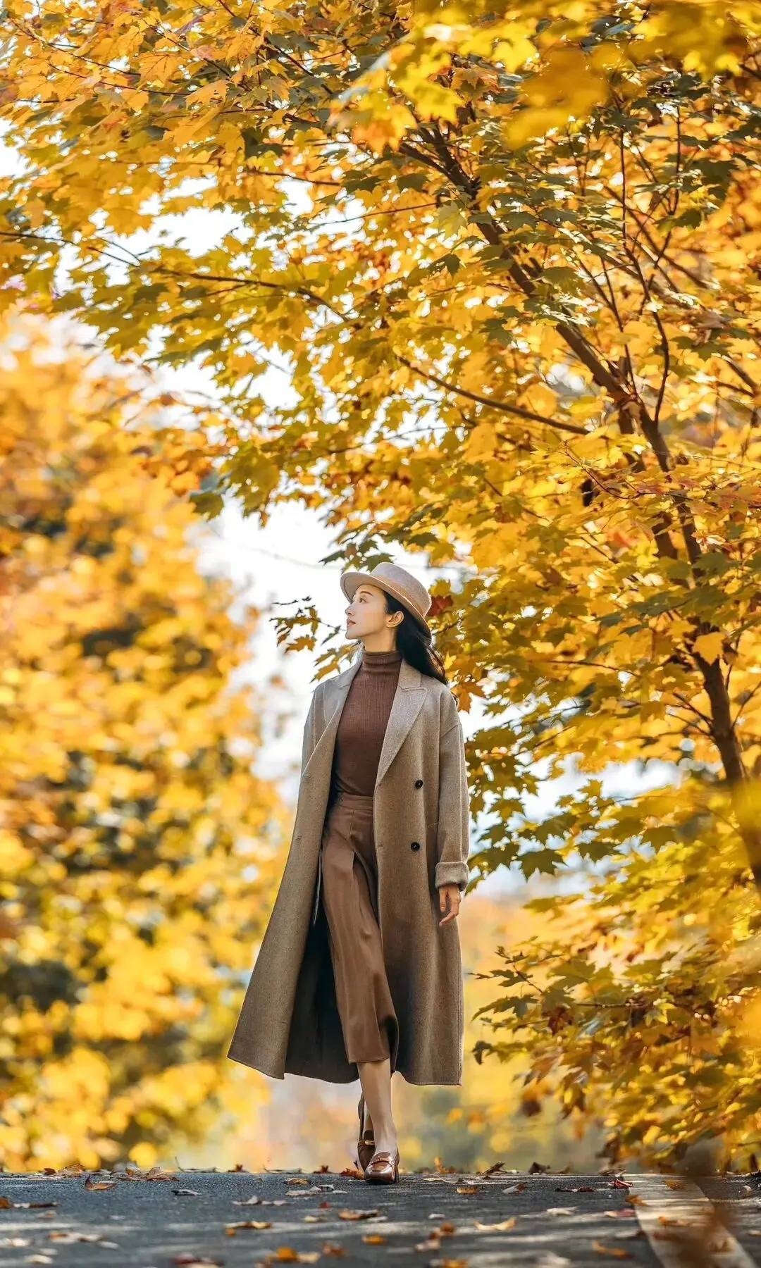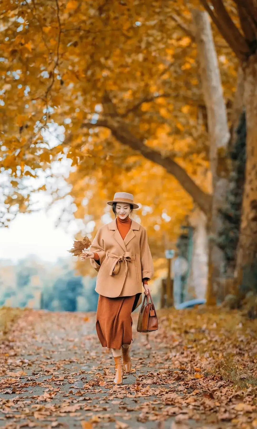 人物漫步在落叶小径,一手轻拈枫叶作道具,衬得神态更松弛鲜活,另一手自然拎着包袋,让肢体随步伐轻晃。暖调大衣的系带线条柔和,不用刻意摆型,让笑意顺着眉眼漫开,金黄树影裹着秋光,把秋日的温柔氛围感直接揉进了每一步里