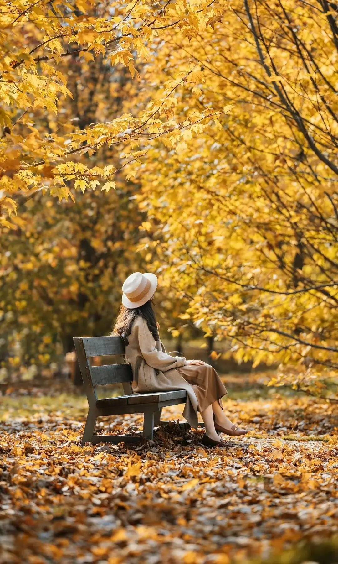 人物侧坐在长椅上,后背轻靠椅身,裙摆自然垂落裹住落叶,一只手松搭在腿侧,姿态松弛得刚好。帽檐衬着后背的线条,不用刻意回头,让视线轻落在秋林里,暖黄枝叶裹着柔光,把秋日的慵懒氛围感揉进了每一处舒展的细节里