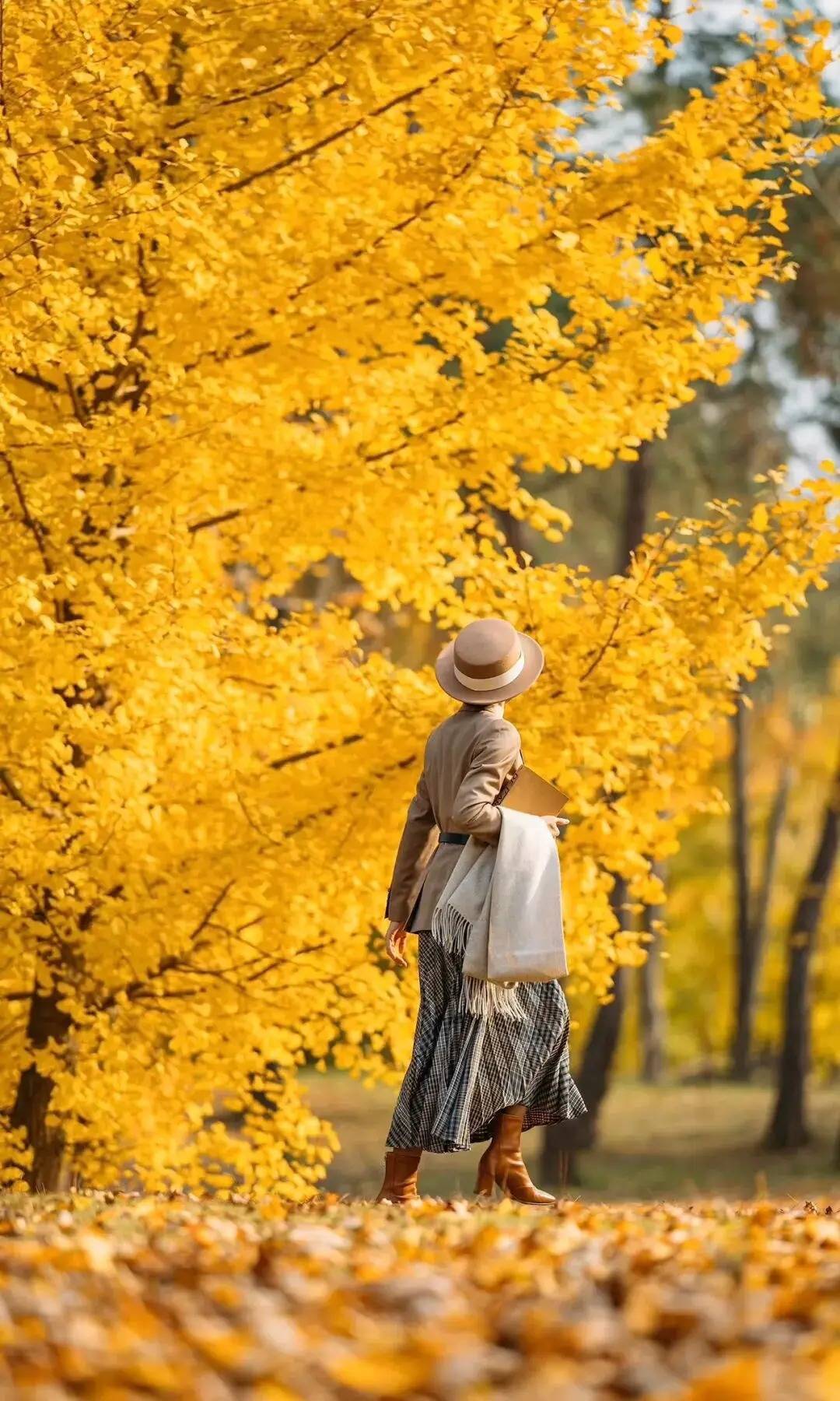 人物背身慢走,裙摆随着脚步轻扬,自带慵懒的动态韵律。一只手随意搭着书本,另一只手把围巾松松挎在臂弯,不用回头看镜头,让帽檐和肩头的线条浸在秋阳里,背景的金黄枝叶刚好衬出松弛的氛围感,像把秋日的温柔都裹进了步伐里