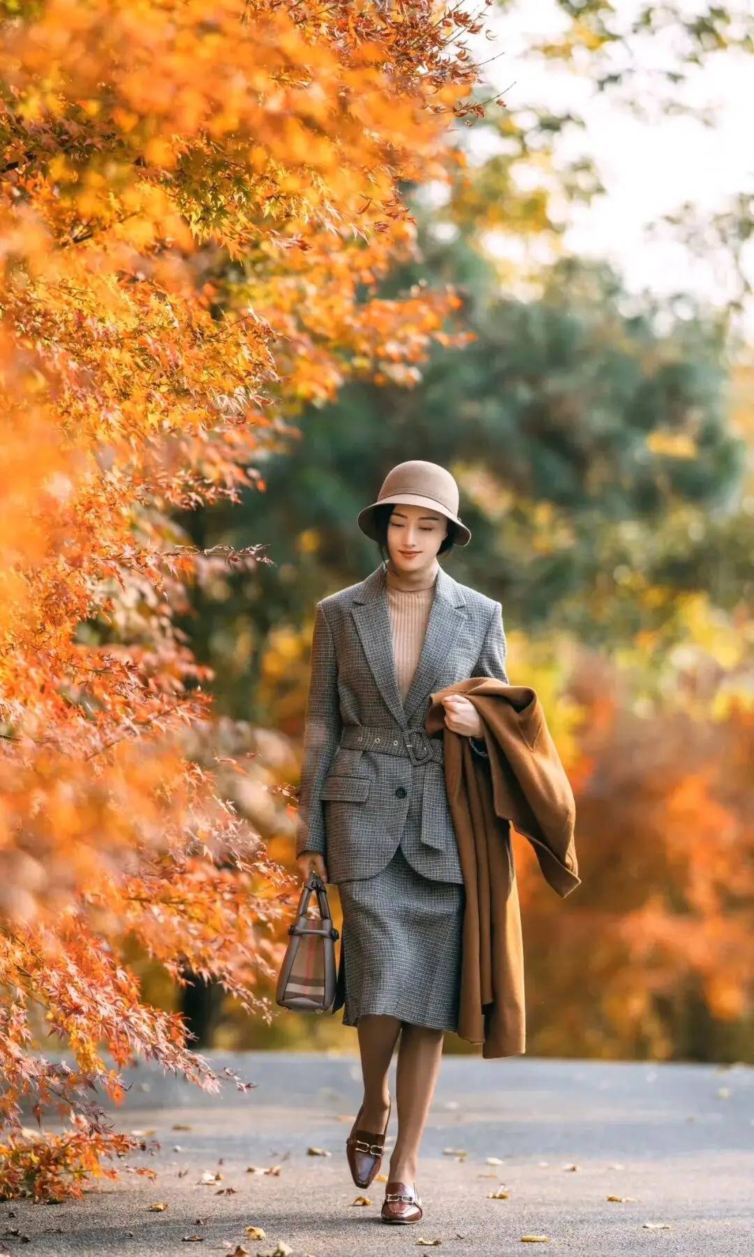 人物缓步走在秋径上,一手轻挎外套,一手拎着包袋,肢体松弛得刚好。微微垂眸的神态衬出温婉,西装裙摆随步伐轻摆,不用刻意定点摆拍,让动作顺着走路的节奏自然舒展,暖调秋林作背景,把优雅松弛的氛围感揉进了每一步里