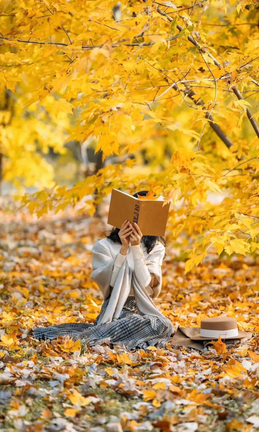 人物席地而坐,裙摆随意铺展在落叶里,裹着软绒围巾的肩头松松垮垮,恰好衬出松弛感。双手把书本举在脸前,既能藏起镜头尴尬,书页间落的枫叶又成了天然道具。不用刻意摆型,就让肢体随着秋意舒展,慵懒氛围感直接拉满