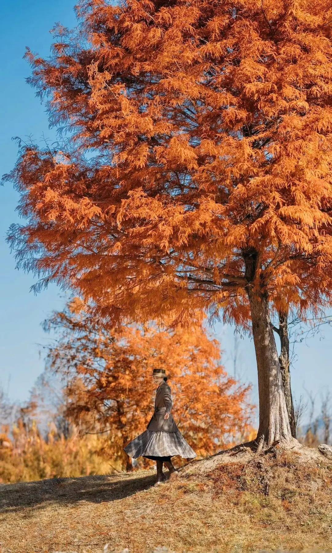 人物沿着坡地轻步走,裙摆随着步伐自然漾开,裹出柔和的动态曲线。一手松垂身侧,帽檐斜搭的角度衬出慵懒,不用刻意看向镜头,让视线跟着脚步的方向轻落,橙红树影作背景,把秋日的松弛氛围感揉进每一个舒展的动作里
