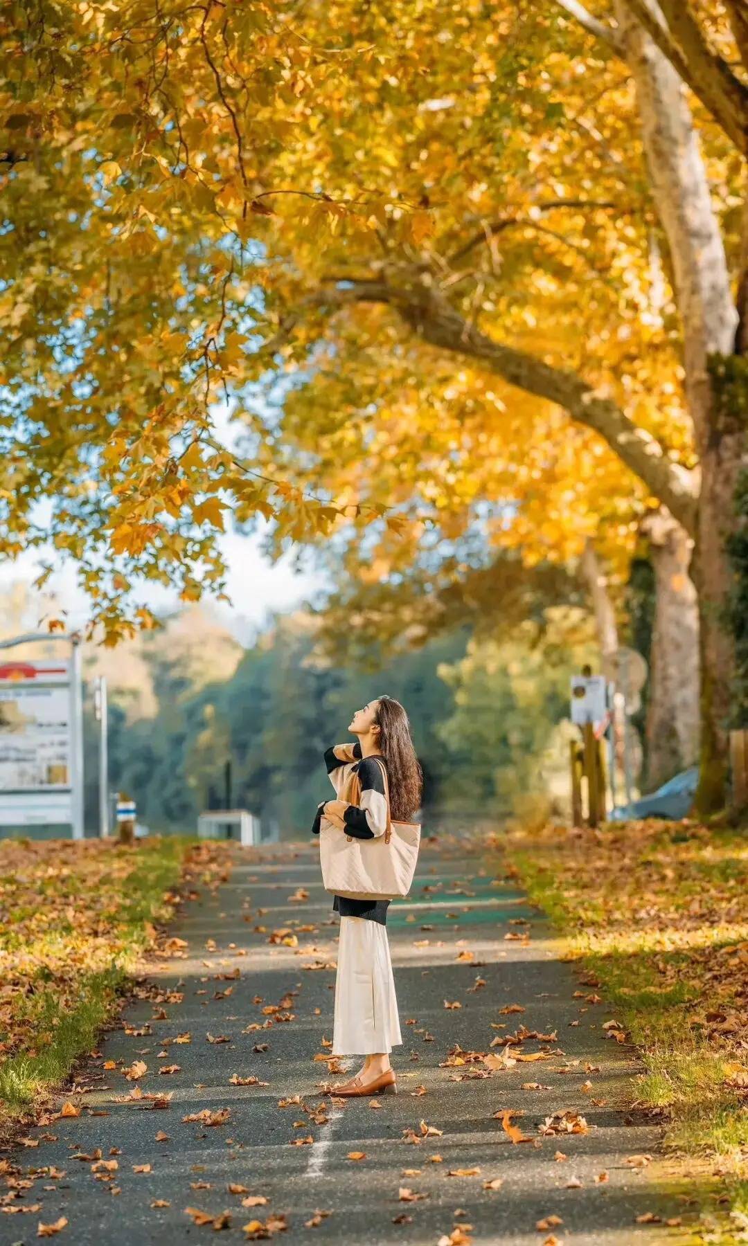 人物抬眼轻仰,松弛的脖颈线条刚好接住秋阳的暖光,一只手搭在肩颈,另一只手自然环住包身,既藏住局促又衬出慵懒。裙摆随步幅轻晃,脚边落枫作衬,不用紧盯镜头,让视线追着叶隙的光走,氛围感就裹满了整个画面
